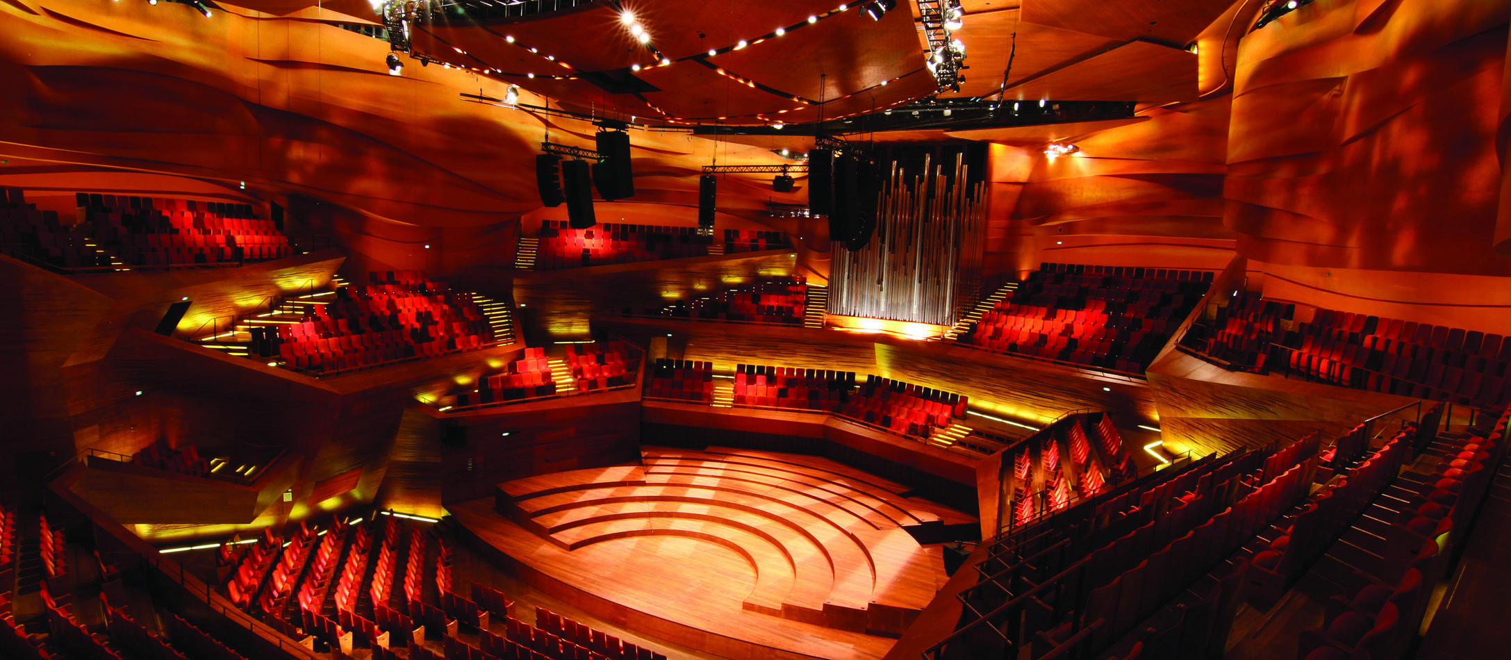 På rundvisningen besøger vi blandt andet Koncertsalen, der er opført som en arenascene med plads til 1.800 publikummer – placeret både foran, rundt om og bagved orkesteret. Oplevelsen af, at man som publikum slår kreds omkring orkesteret og kan se sine medpublikummer, gør koncertoplevelsen til noget ganske særligt. Udover Koncertsalen er der 3 øvrige sale med hver sit enestående design. Til hver sal er der kontrolrum, solistrum og øvelokaler.