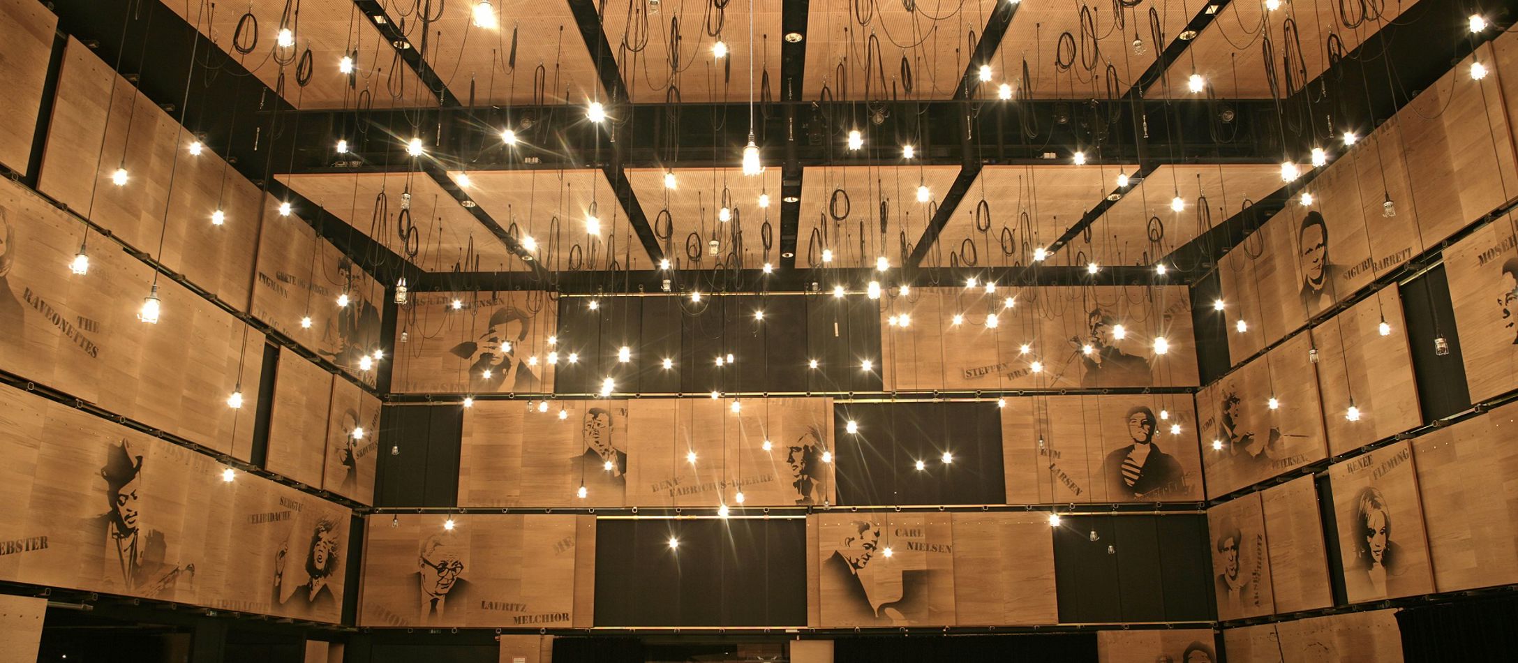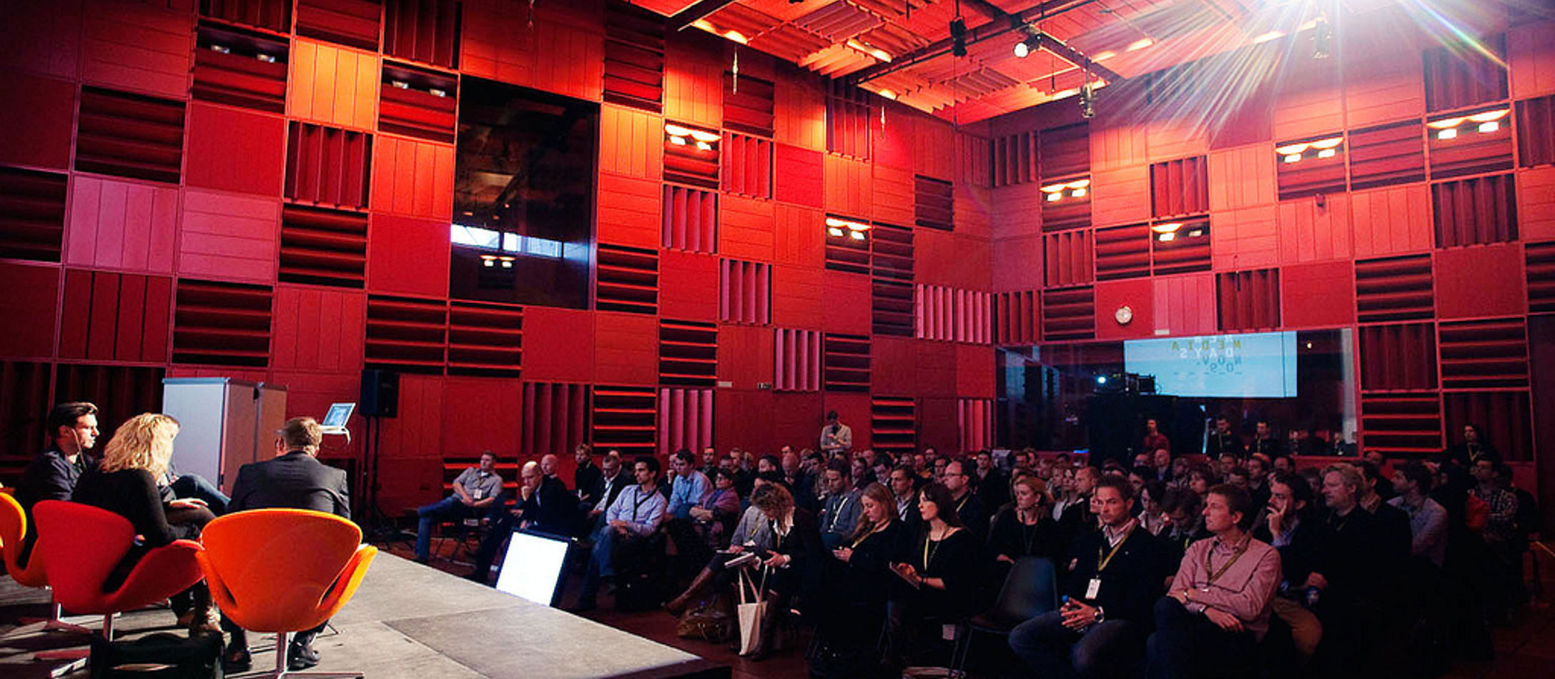 Lydregulerende vægpaneler er formet som aflange, trekantede Toblerone-chokoladeæsker. Rummets fortættede stemning understreges af den intense røde farve, der pryder både vægge og loft.
