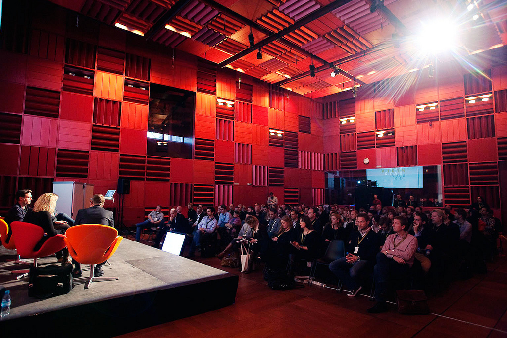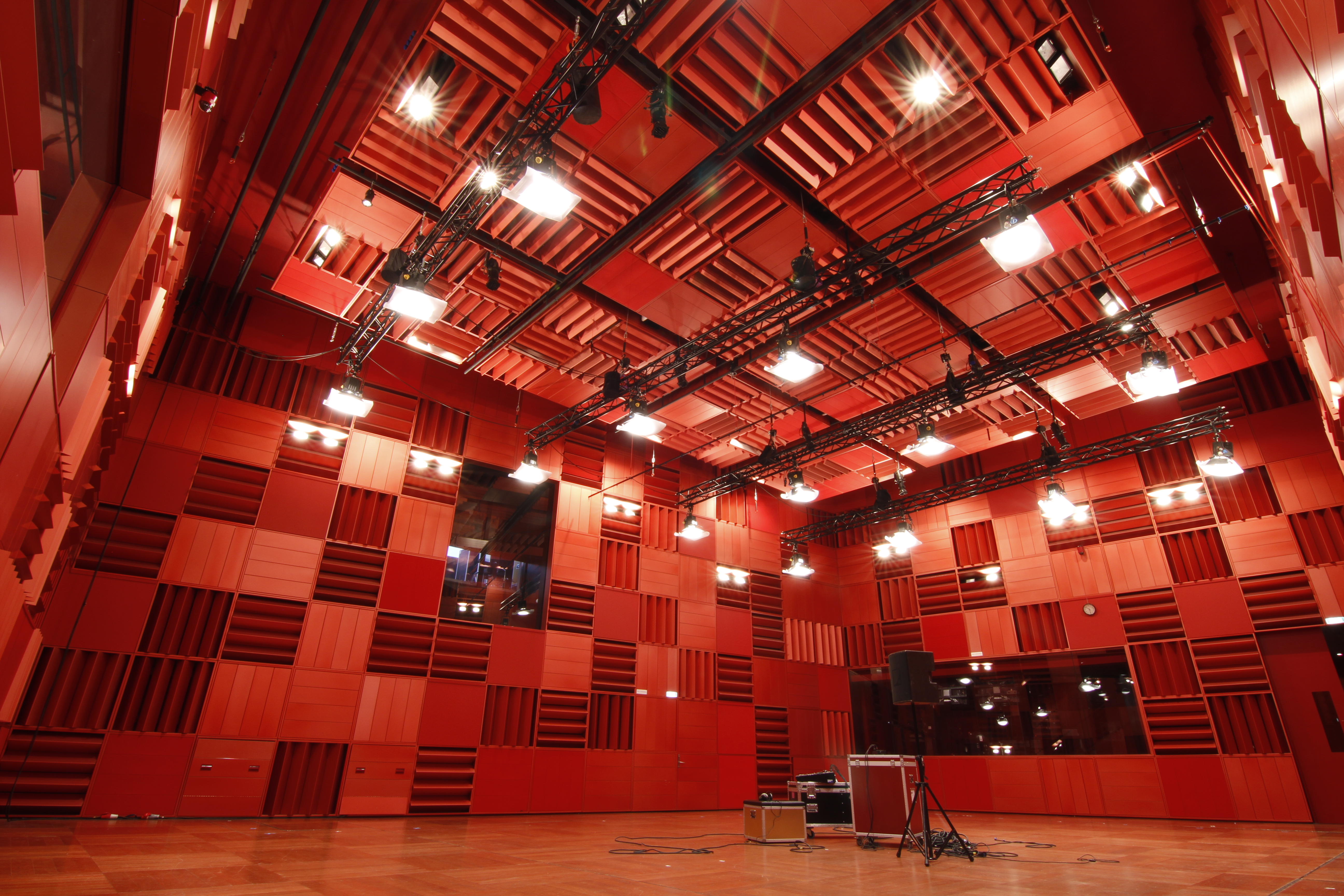 Lydregulerende vægpaneler er formet som aflange, trekantede Toblerone-chokoladeæsker. Rummets fortættede stemning understreges af den intense røde farve, der pryder både vægge og loft.